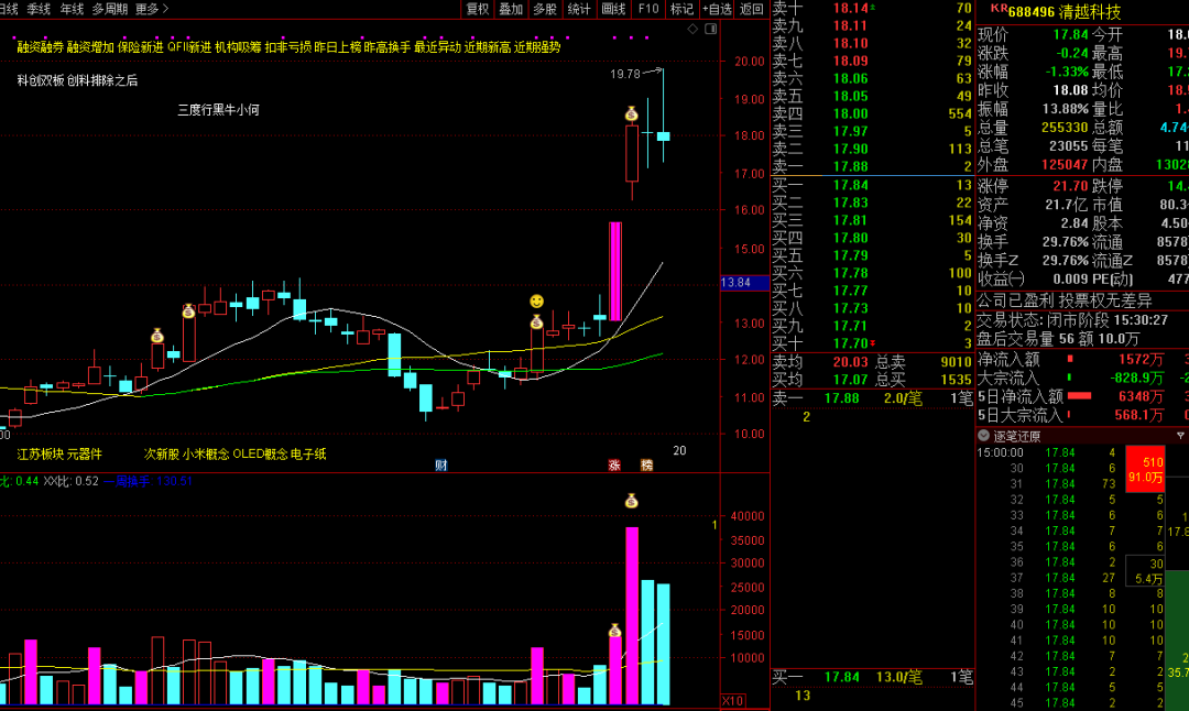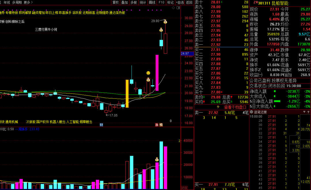 周三:5月17日,昆船智能(301311),理工光科(300557),震有科技(688418),三六五网(300295),兴齐眼药(300573),蜀道装备(300540)等表现不错。这类股票行情,一部分是短线,也有一两只会有波段行情。无论强势短线还是潜在强势波段,其转折点或启涨点都蛮经典。“强势、经典”是三度理论总体系及实战体系最根本,而热点与主流是三度人高度关注不松懈的市场之风。