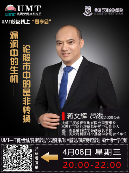 疫情当下,身在股市中的你过的如何?炒股尤如用兵,不知兵法而决战沙场,怎能运筹帷幄,决胜千里?在股市交易投资的同学们注意了,UMT福利沙龙隆重登场了!!! 4月08日晚上20:00-22:00(周三),UMT校友线上“思享会”第五期直播现场将由UMT金融DBA、校友会名誉会长、成都三度教育咨询有限公司 董事长、三度行市场经济信息研究中心创办人蒋文辉老师带来《漏洞中的生机,论股市中的是非转换》课程,蒋文辉老师将为大家分享他十多年的实战投资干货,解密股市赢利之道,助你穿越牛熊,决战2020年! 一场“谈股论金”的分享盛宴即将开启,想要通过股市投资实现资本倍增的同学,绝对不能错过此次机会! 主题: 《漏洞中的生机,论股市中的是非转换》 时间: 4月08日 20:00—22:00 大纲: 1.中国股民队伍 2.市场没有错,但有“漏洞生机” 3.股市中是非转换 4.踏准节奏 锁定机会