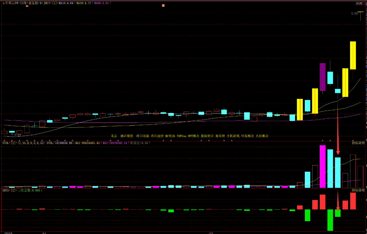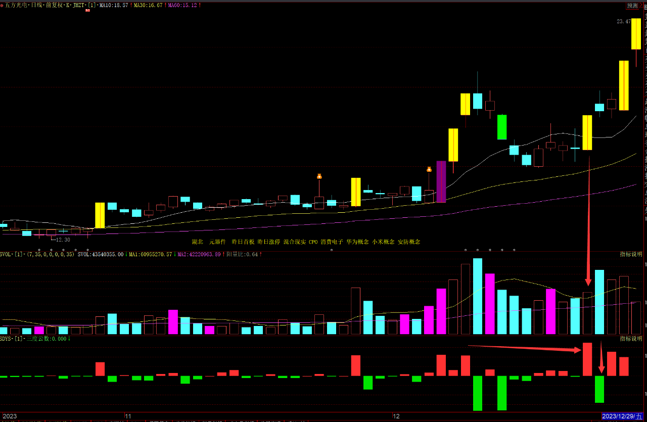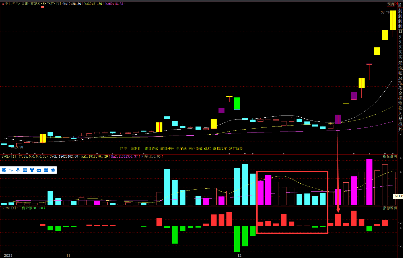 亚世光电 (002952)前期三个涨停板后股价回落并释放较大阴量,随后新资金再次进入并再度回调,回调期间云数极其收敛。12月20日B区反转涨停,成交量柱子低,但云数相对较大,次日空板,第三日仍可介入,因为它是龙头,随后股价进入强势拉升段。